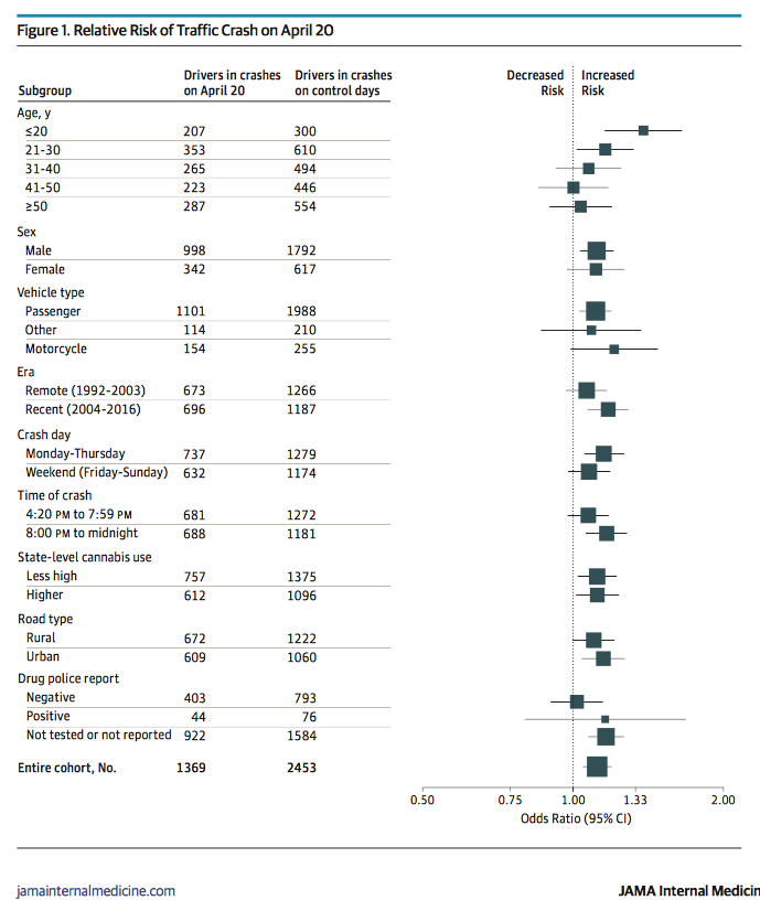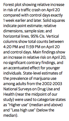"As expected, the number of drivers involved in crashes, earlier than 4:20 PM or on nearby dates (April 18 and April 22)," wrote the study's authors, "was no different than corresponding controls."