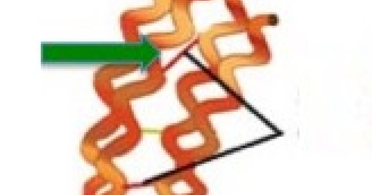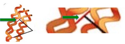 Figure 4. A model of keratin (orange curls). The red line (green arrow) represents the cystine disulfide bond that is broken.