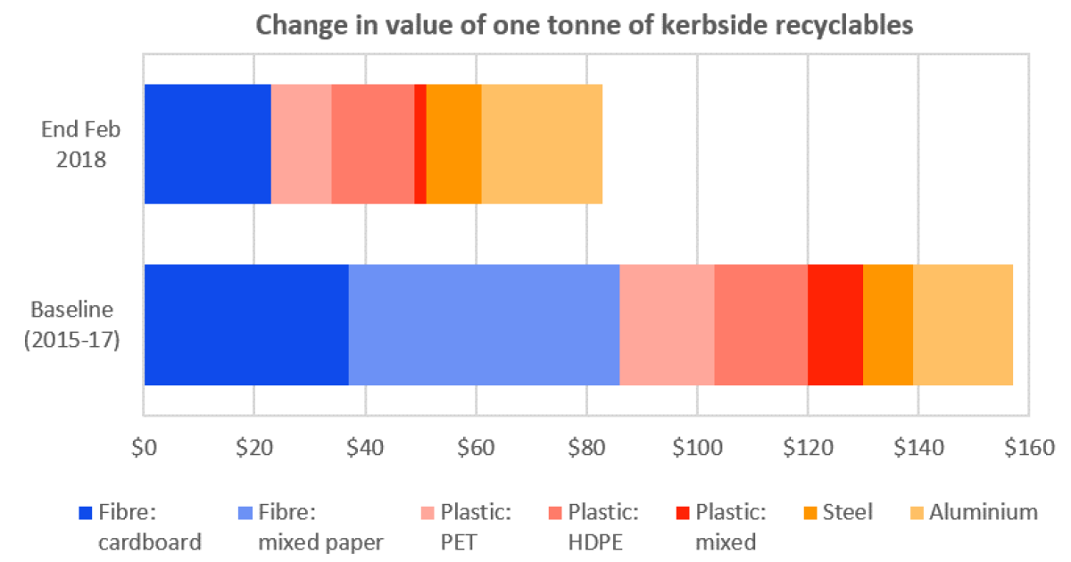 Australia has limited local markets for household recyclables like paper, plastics and glass, so we rely heavily on overseas markets like China to buy and reprocess the waste. Losing the market for a third of our paper and plastics – as have many other industrialized countries – has sent shockwaves through the global recycling market. Oversupply has caused the average price of mixed paper scrap to fall from around AU$124 per ton to A$0 per ton (yes, zero!). Scrap mixed plastics has fallen from around A$325 per tonne to A$75 per ton.