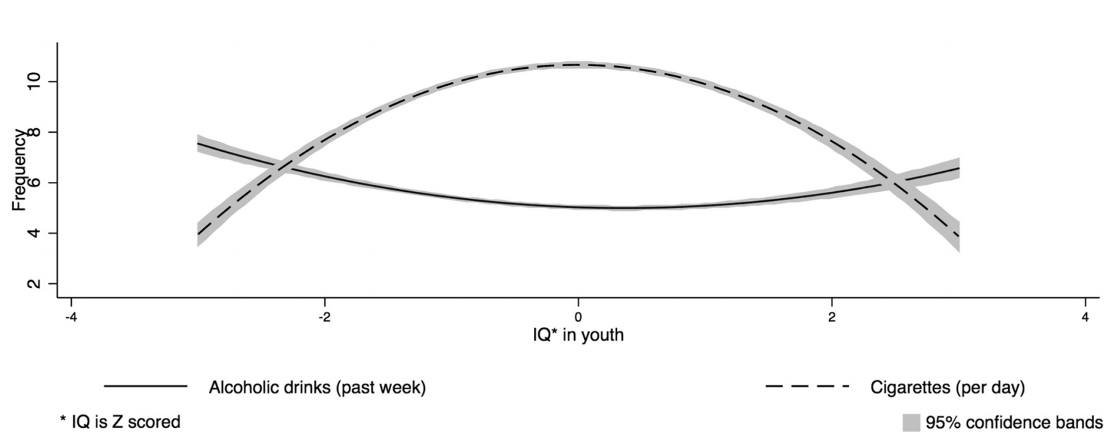 An inverted U-shape was found for the association between youth IQ and skipping meals as adults. It is difficult to make sense of this relationship, partially because the U-shaped graph only included people who reported skipping meals. Among people who did, both low- and high-IQ people skipped the fewest meals, while average IQ people skipped the most. (The same inverted U-shape was found among people who smoked. See graph above.)