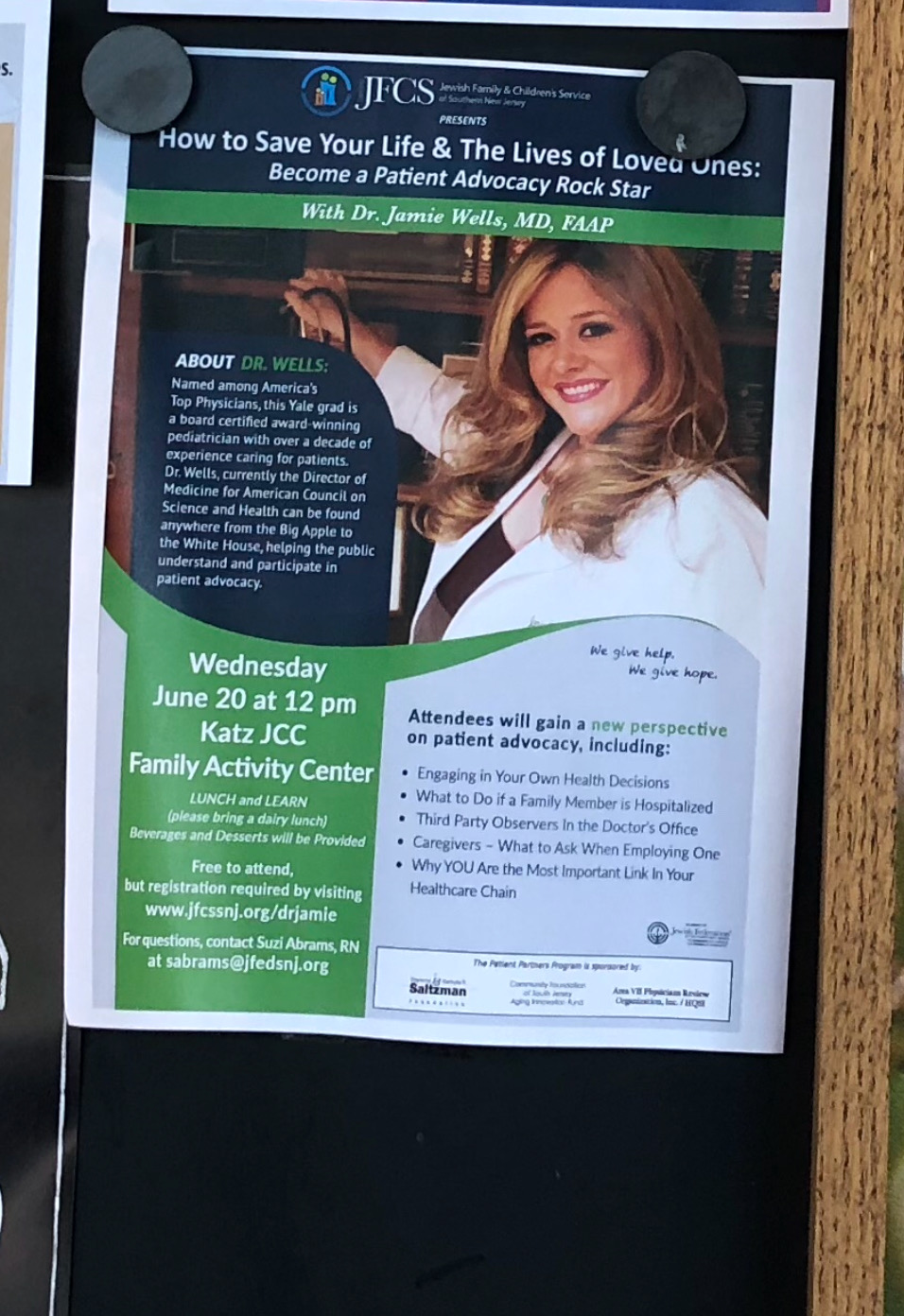 It was such a privilege and honor for me to be invited by the incomparable Suzi Abrams and Jewish Family & Children’s Services of Southern New Jersey to present on how to be an advocate for yourself or a loved one in the medical realm. To inform from a physician's perspective, I put together a guide on the subject that can be found by scrolling down in this article. The topic of patient advocacy is very close to my heart, so when I was invited to speak by someone I deeply admire who runs an effective, successful program the community vitally needs, it was a no-brainer. By training volunteers to be advocates for seniors, Patient Partners - led by Abrams (pictured here with me), a seasoned nurse and program coordinator - not only empowers them, but also tangibly achieves greater compliance, reduced hospitalization and readmission rates.