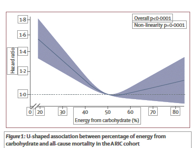 “…the relationship between carbohydrate consumption and risk of mortality was significantly non-linear (p<0.001), resulting in a U-shaped association, with the lowest observed risk associated with carbohydrate consumption of 50-55%.”