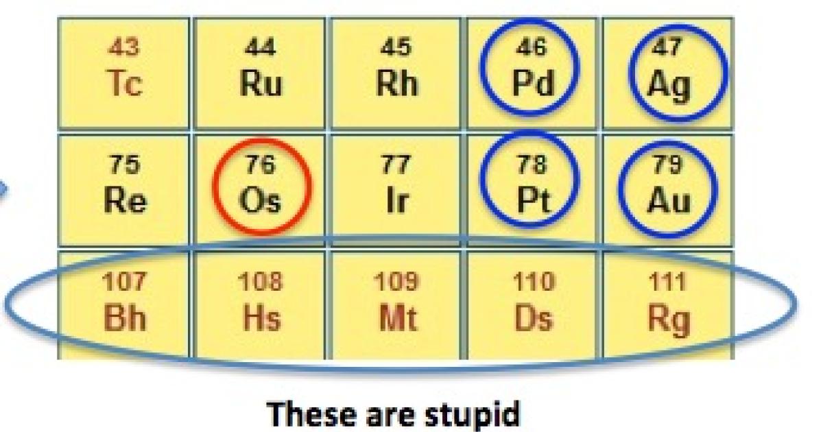 But just cause I'm deeply disturbed does not mean that this isn't an interesting topic. It is. Osmium is rare and has some distinctive properties that make it a fascinating element. It is plopped in the middle of the periodic table and has some mighty strange neighbors, some of which don't really exist (1). But it also has some valuable neighbors - palladium, silver, platinum, and gold (Figure 1).