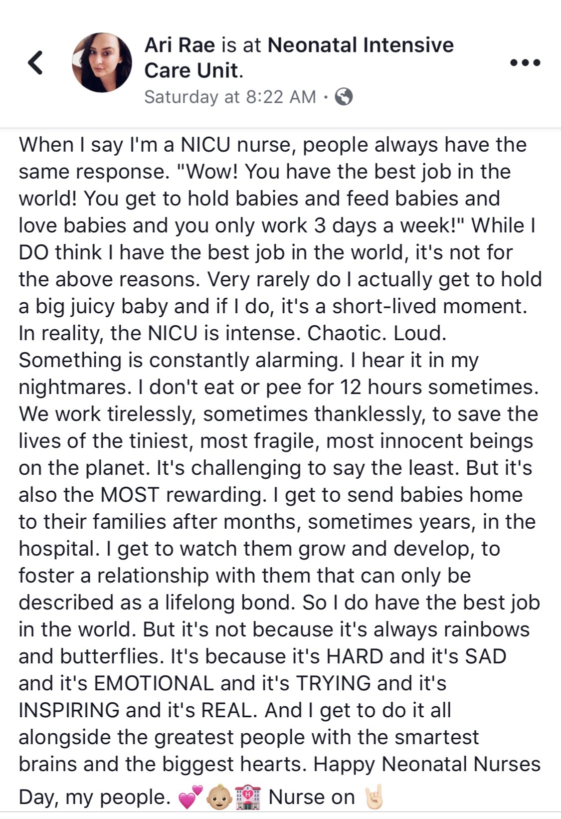 “While I DO think I have the best job in the world, it’s not for the above reasons. Very rarely do I actually get to hold a big juicy baby and if I do, it’s a short-lived moment. In reality, the NICU is intense. Chaotic. Loud. Something is constantly alarming. I hear it in my nightmares. I don’t eat or pee for 12 hours sometimes. We work tirelessly, sometimes thanklessly, to save the lives of the tiniest, most fragile, most innocent human beings on the planet. It’s challenging to say the least. But it’s also the MOST rewarding. I get to send babies home to their families after months, sometimes years, in the hospital. I get to watch them grow and develop, to foster a relationship with them that can only be described as a lifelong bond… So I do have the best job in the world. But it’s not because it’s always rainbows and butterflies. It’s because it’s HARD and it’s SAD and it’s EMOTIONAL and it’s TRYING and it’s INSPIRING and it’s REAL. And I get to do it all alongside the greatest people with the smartest brains and the biggest hearts. Happy Neonatal Nurses Day, my people. Nurse on.”