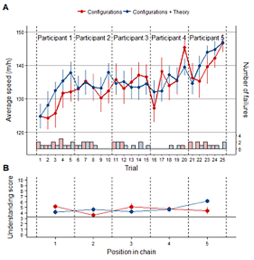 In the evolutionary group, participants were provided the last two designs and their associated scores; for the cognitive group, they were given the theory and the last two designs and scores. Participants received token payments based on their performance and the next two trials in their evolutionary or cognitive chains.
