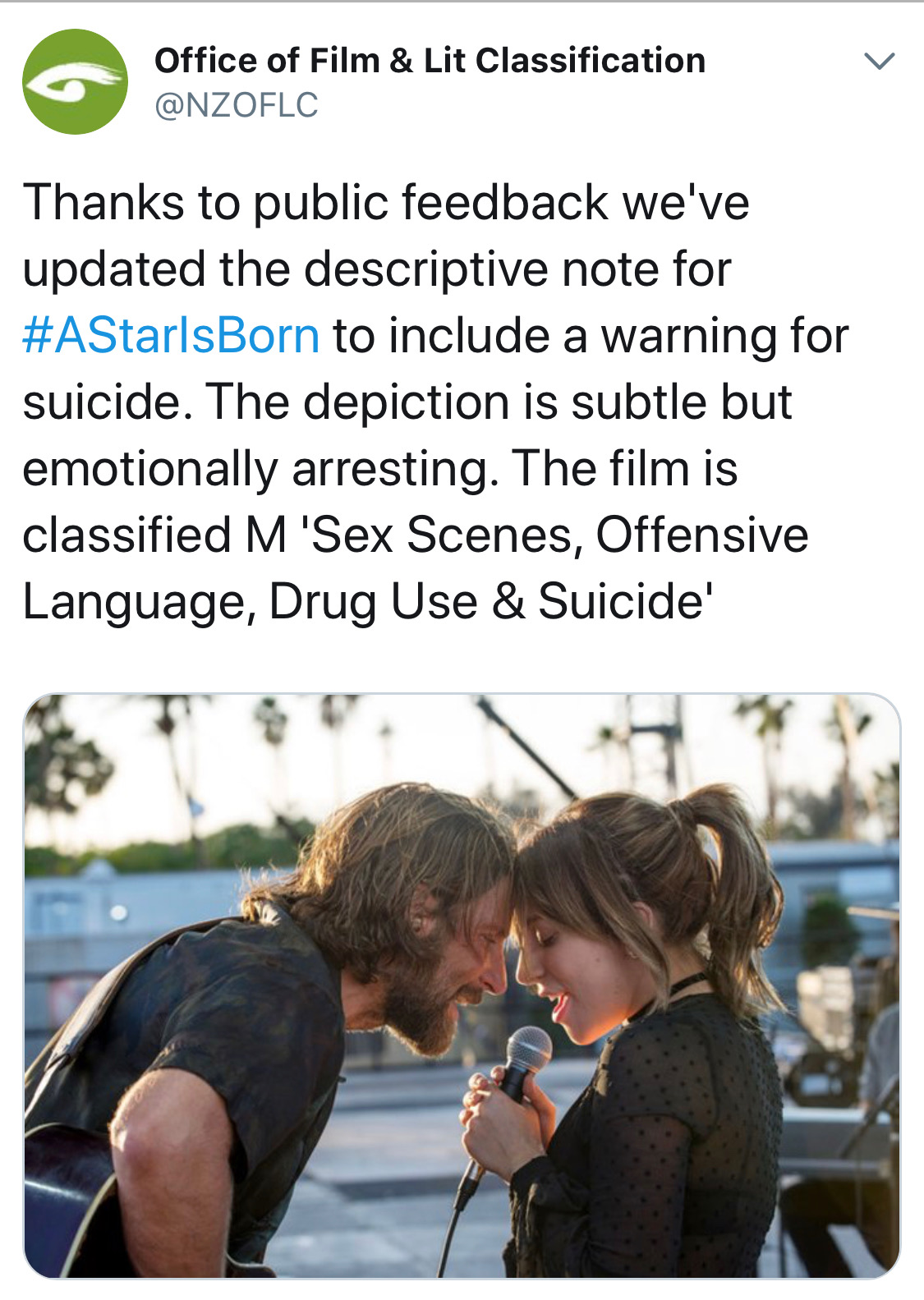 Bradley Cooper’s directorial debut, A Star Is Born, featuring himself and Lady Gaga is receiving critical acclaim, early Academy Award buzz and international mega-success. That said, the Chief Censor in New Zealand, who is in charge of stratifying movie rankings, just uprated the film adding a specific warning to moviegoers that it contains suicide in its content. He felt compelled to do so after complaints, in particular from the Mental Health Foundation and Police Victim Support team, were raised that it “severely triggered” some viewers.