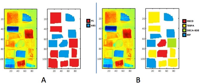 The use of hyperspectral imaging combined with chemometrics can identify (A) the type of polymer (PS = polystyrene, ABS = acrylonitrile butadiene styrene) and (B), the fireproofing chemical used in the plastic. (HBCD = 1,2,5,6,9,10-hexabromo-cyclododecane, TBBPA = 3,5-tetrabromobisphenol A, Pentabromophenyl ether (DECA-BDE). The blue shapes are reference samples, which have no fire retardant added. Source: "Application of hyperspectral imaging and chemometrics for classifying plastics with brominated flame retardants." Journal of Spectral Imaging Volume 8 Article ID a1 (2019 ).