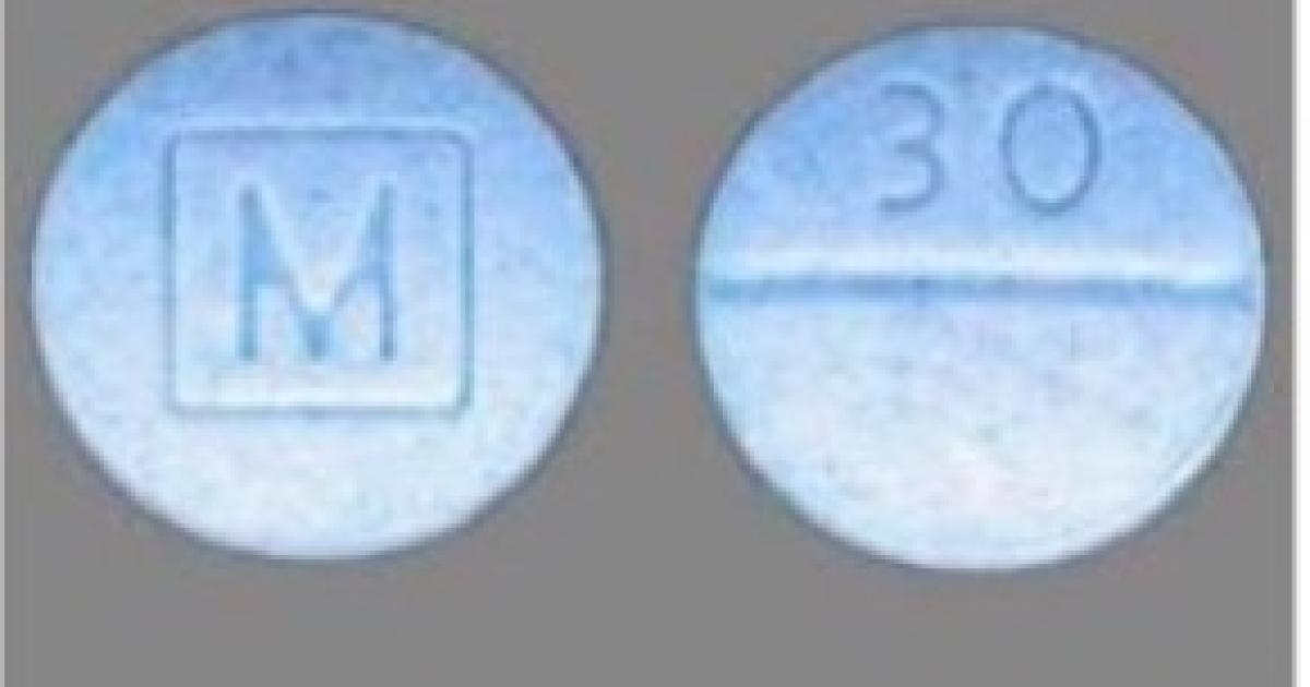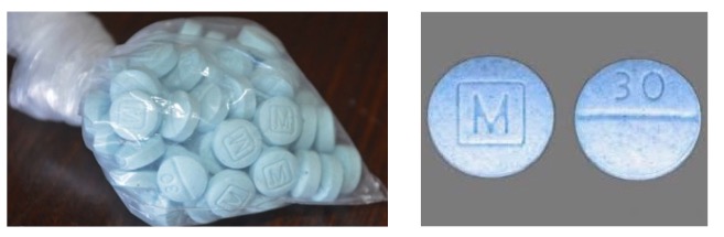 (Left) Mexican Oxy seized by the DEA. (Right) A 30 mg oxycodone tablet. Photos: DEA