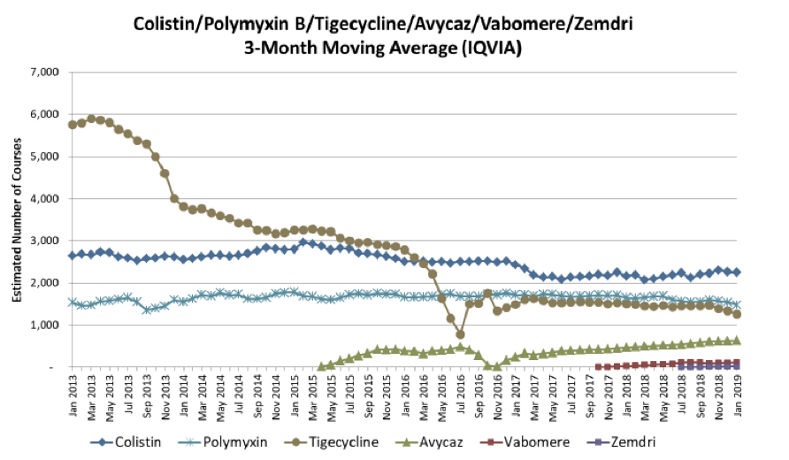 The first step is for the Infectious Diseases Society of America and perhaps the American Thoracic Society to provide clear clinical guidance that makes the use of colistin and polymyxin a practice of the past except in cases where there really is absolutely no other choice. The availability of new antibiotics like ceftazidime-avibactam, ceftolozane-tazobactam, meropenem-vaborbactam and plazomicin should all be prioritized over colistin/polymyxin for the treatment of Gram-negative infections where resistance is suspected or documented. Recent US data from Alan Carr on the use of Dificid for C. difficile diarrhea shows that guidance can make a huge difference in use (above). Compare that to the use of newer antibiotics for the treatment of carbapenem-resistant Gram-negative infections from the same report (below).