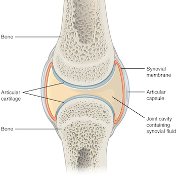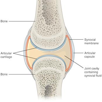 Most of the joints in our body are known as synovial joints. (See upper left image.) At a synovial joint, two cartilage-covered bones meet, and they are separated by a slippery synovial fluid that helps lubricate movement. (Without synovial fluid, the bones would grind against each other.)