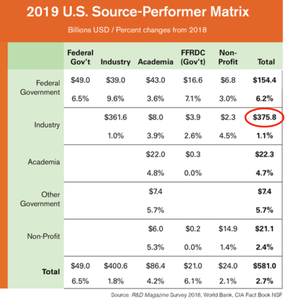 However, good science comes from many different places, including industry. Industry research cannot and should not be written off because, according to R&D Magazine, industry is responsible for funding nearly $376 billion of the total $581 billion that our country will spend on research in 2019. In other words, about 2/3 of all R&D in the United States is paid for by industry. Without it, research would come to a grinding halt.