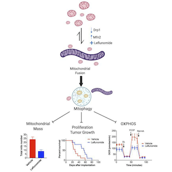 The cancer cells don't seem to be very happy with this. The authors then demonstrated that the fused mitochondria are systematically destroyed in a process called mitophagy. From the cancer cell's perspective, this is counterproductive because it is destroying its own power supply. As a result, in various mouse models of pancreatic cancer, leflunomide prolonged survival.