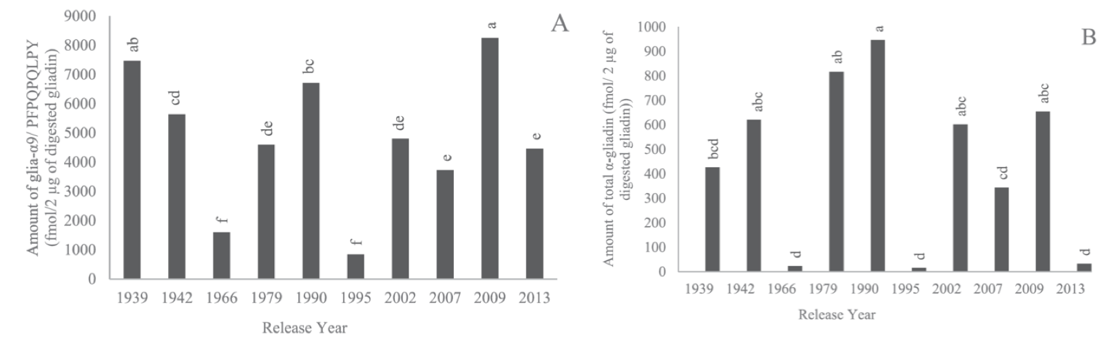 Fig 1: Amount of glia alpha-9 (A) and total alpha-gliadin (B) in historical and modern hard red spring wheat (Figures from Malalgoda et al. (2018).