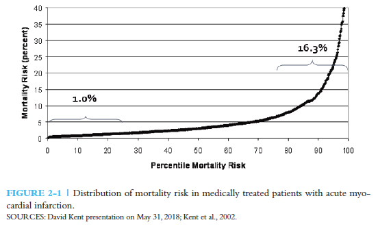 A discussion at the National Academy of Medicine doesn’t answer the question but provides a bit of guidance. It is reasonable to argue that when the outcome varies across sub-groups, the tradeoff between benefits and harm varies. In this graph showing the risk of death after myocardial infarction, only 20% of patients had risk higher than the population average of 6%; and even within their ranks, there was considerable variation. The majority of patients had a risk below average. The trick is to be able to identify the top tier from the majority. A similar diversity of outcomes can be found when looking at harms or complications of the proposed treatment. Population averages “often over-estimate the benefit in most patients and may obscure the harm in many others.” So the first solution in guiding the care of the individual is to regroup the data based on a patient’s risk and apply the same risk stratification to your patient.