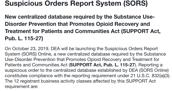 The Suspicious Orders Report System (SORS) is a new online centralized database required by the Substance Use-Disorder Prevention that Promotes Opioid Recovery and Treatment for Patients and Communities Act. Pharmacies, hospitals, clinics, doctors and even EMS workers are now required to report a “suspicious order” to the centralized database established by DEA (SORS Online).