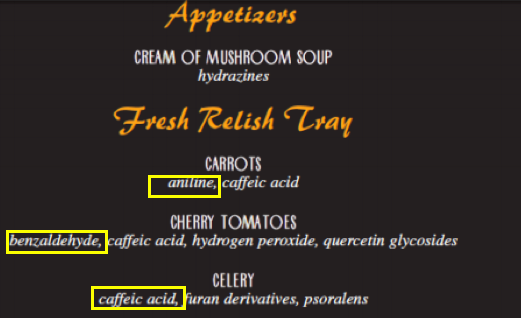 The choice of appetizers will be a bit limited. Below is the appetizer section of the menu with certain chemicals of interest highlighted in yellow boxes. I have taken the liberty of looking up each of these in the EWG chemical database. Of course, no self-respecting anti-chemical activist would ever consider putting any of this poison in his or her mouth.