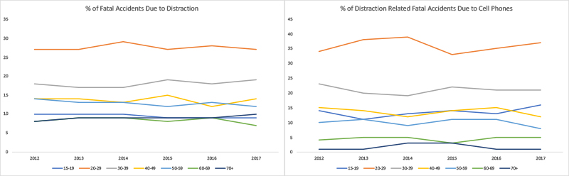 - Drivers, age 15-19 had the highest percentage of distracted drivers in these fatal accidents at 9% followed closely at 7% by drivers age 20-29. Subsequent age groups contributed 5-6% each.