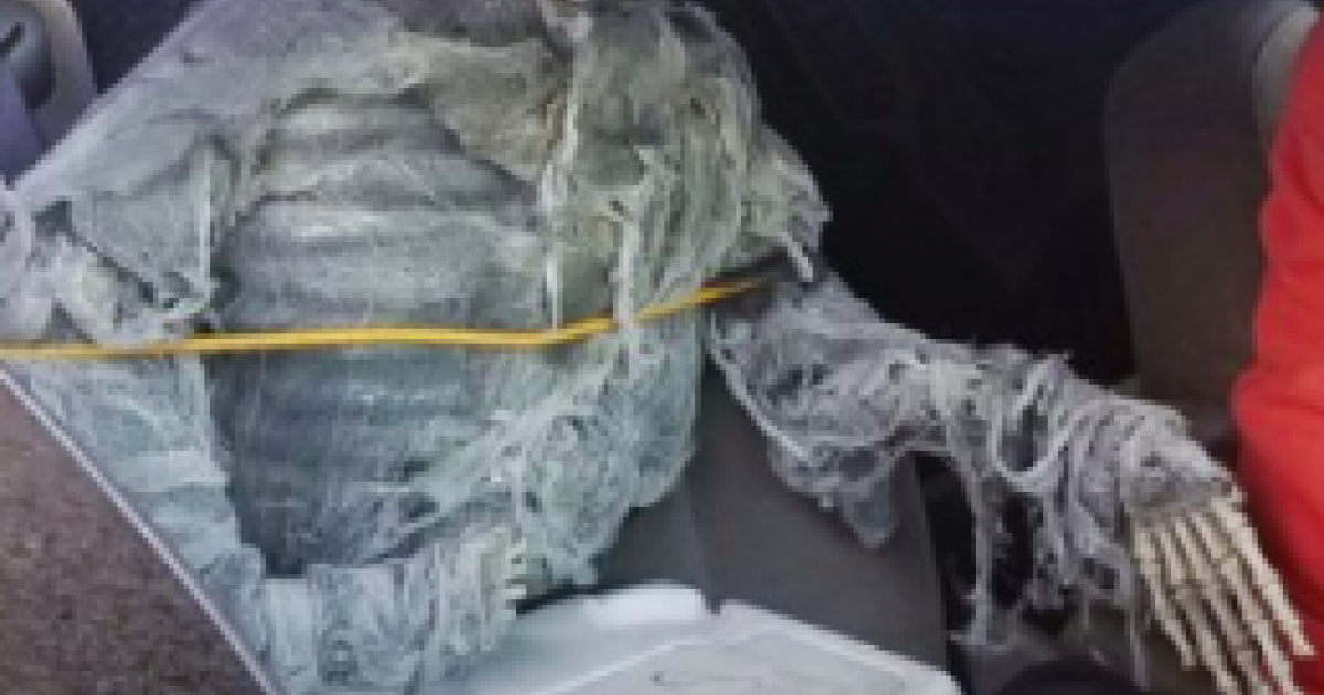 Yep, some lunatic was pulled over by an Arizona State Trooper who noticed that there was a skeleton strapped into the passenger seat acting as a decoy so that the driver could use the HOV lane. You have to give the guy style and creativity points, especially for the plastic box (don't you want to know what's in it?) that looks like it's sitting on a non-existent lap.