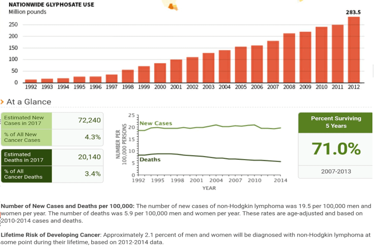 In fact, we have valuable information relevant to this point. The application of glyphosate to crops has increased about 15-fold since Roundup-ready crops were introduced in 1996. What has happened to the rates of NHL over the past 25 years? As shown in the figure below, while the use of glyphosate increased markedly, the incidence of NHL has remained flat, and mortality from NHL has decreased.