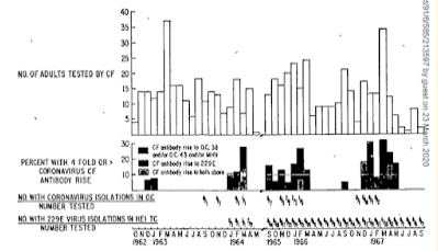 Coronavirus colds, in temperate climes, have a clear seasonality with a preference for the winter months (Figure below, in bar chart). They occur more sporadically in tropical climates, but there they seem to prefer spring and fall.