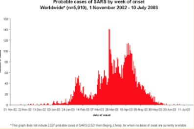 And SARS was more deadly with a mortality rate approaching 10%. Covid-19 looks like it will end up with a mortality rate of well under 1% globally when all the testing is finally done. This figure will depend on many factors including the capacity and quality of the healthcare systems where the epidemic is occurring. SARS ultimately infected 8000 people globally with the vast majority of cases in Asia and caused over 700 deaths. But the most hopeful observation about SARS is its epidemic curve (see bar chart directly below). The pandemic started in November of 2002 but was over by July of 2003. Why? It’s hard to believe that suddenly our ability to carry out case-finding and isolation of contacts had improved to the point where we could stop the virus in its tracks. I’m voting for seasonality. Why didn’t it come back the next year? Certainly not because the world was immune. I don’t know – perhaps some of you have the answer.