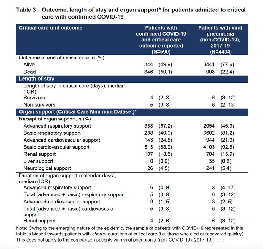 Taken from the UK's Intensive Care National Audit & Research Centre - a table from their report, as of April 4th showing the COVID-19 critical care admissions. They include in the far right column their 2017-19 data on critical care hospitalizations for Non-COVID-19 viral pneumonia, "the flu." COVID-19's data remains in flux. But you can begin to see how much COVID-19 is the same and different from "the flu."