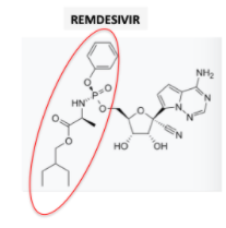 (1) Remdesivir is a pro-drug of remdesivir triphosphate. The pro-drug fragment is shown in the red oval. The cleavage of the pro-drug to the drug is an enzymatic reaction.