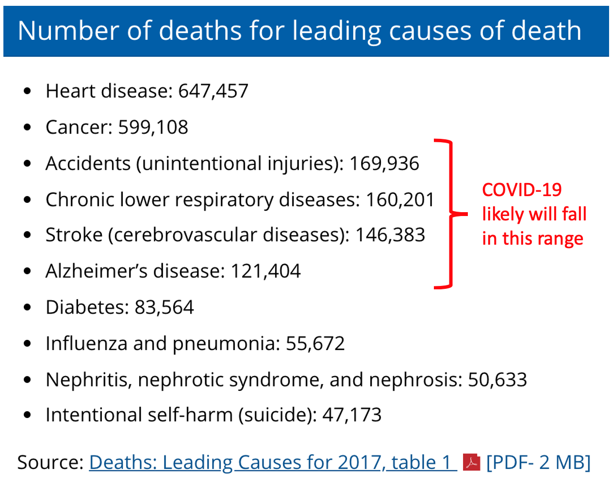 As shown above, a death toll of 115,000 is well behind the #1 and #2 causes of death (heart disease and cancer, respectively), but in the same range as causes #3 through #6 (in order: accidents, chronic lower respiratory disease, stroke, and Alzheimer's). Notably, the COVID-19 death toll is roughly twice as high as that of influenza/pneumonia.
