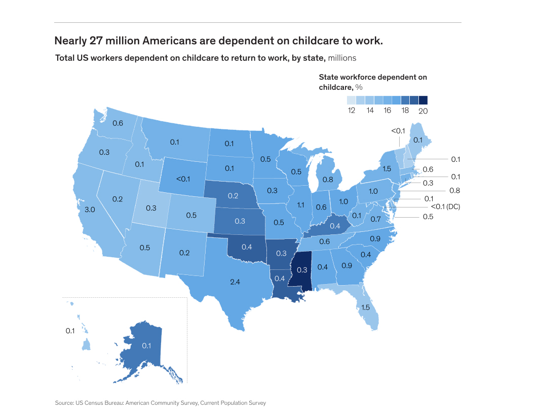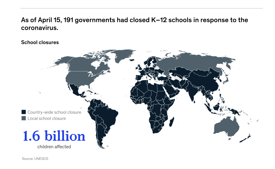 It has been some time since my children were in school, even longer since I was in high school let alone elementary school. One of the first realizations from COVID-19 was how our public schools have become the daily source of food for so many of our children. Education and feeding the hungry have become so intertwined. How has COVID-19 changed school and child care? These images are from a report by McKinsey and Co, Charting the path to the next normal.