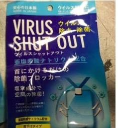 Two unapproved pesticides that were being sold for COVID prevention; (left) Virus Shut Out claimed to be "a spatial disinfection card that would provide coronavirus protection to the wearer." Whatever that means. (Right) Xtreme-Bio, "STOP CORONAVIRUS DEAD IN ITS TRACKS !!!!" But if you look on the company's website you'll find this disclaimer at the very bottom in a font so small that I don't think it's been invented yet.