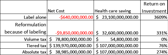 In the final column, I compute a return on investment – for the additional money spent, how much do we save. This is the place where the policymakers tradeoff cost and benefits. If we were all to read labels and make wise choices, we would get the most bang for our buck. Of course, that is not what humans do. The argument for most sin taxes is that we need to be nudged along. Of all the tax schemes, an absolute tax on the quantity of sugar present provides the most significant value, an ROI of 274%. But that value is less than the return on investment of market-driven reformulations at 331%.