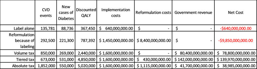 The first three columns show the estimated impact of reducing sugar on reducing cardiovascular events, diabetes, and the resulting changes in the quality of one's life. Any reduction seems to help, but that absolute tax has the greatest impact. The next three columns consider the cost to gain those benefits. Implementation costs refer to spending by the government to write and enforce the laws, as well as collect the taxes in the tax scenarios. It also includes the cost to restaurants and manufacturers for changing labels. Reformulation costs are estimated spending by manufacturers as they reshape their products based on consumer response to the new labels and taxes. Labeling has a small effect on reformulation costs; an absolute sugar tax provided the greatest nudge to reformulation. Government revenue is, of course, the amount of taxes being paid.