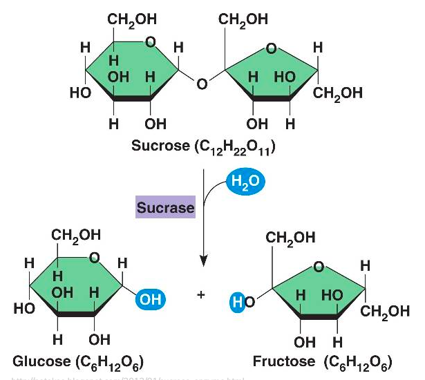 The hydrolysis of sucrose is catalyzed but the digestive enzyme sucrase. Once formed, glucose and fructose are quickly absorbed, either by the stomach or small intestine and enter the bloodstream. Source: Socratic.org