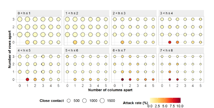 - The average attack rate increased for every hour of co-travel. Again, the further one was away from the index case, either by row or column, reduced the effect of travel time. Those in different rows had less effect of travel time than those in different seats of the index row.