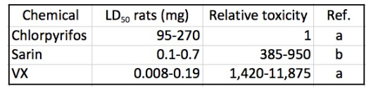 Table 1. The relative acute toxicity of chlorpyrifos, Sarin, and VX in rats. The range of LD50 values represents the toxic dose as a function of the method of exposure, for example, given orally, injected, or applied to the skin. References: (a) Drug and Chemical Toxicology, (b) EXTOXNET