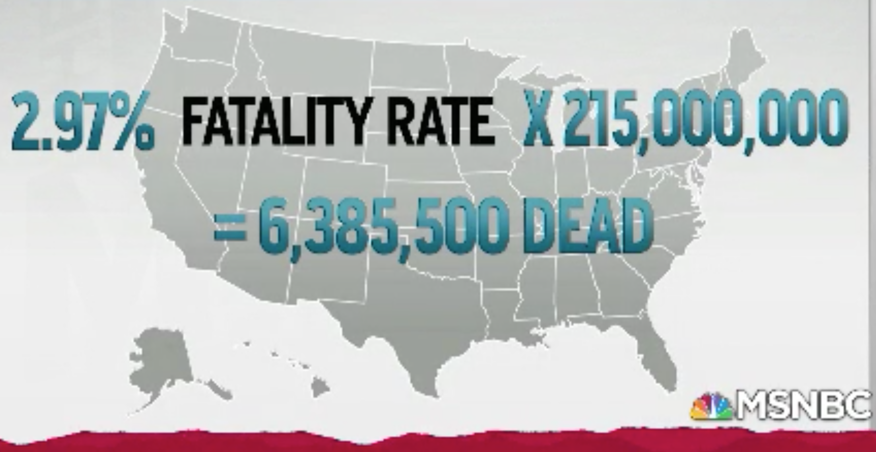 Now, the sleight-of-hand. She claims that a case-fatality rate of 2.97% would mean that, of those 215 million infected Americans, about 6.4 million would die.