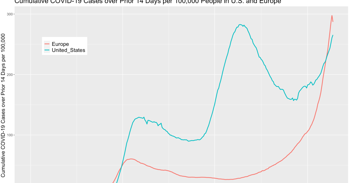 Two things are obvious from this graph. First, Europe has surged past the U.S. in the number of new infections, even after taking its larger population into account. Second, while Europe is entering a second wave, the U.S. is entering a third wave.