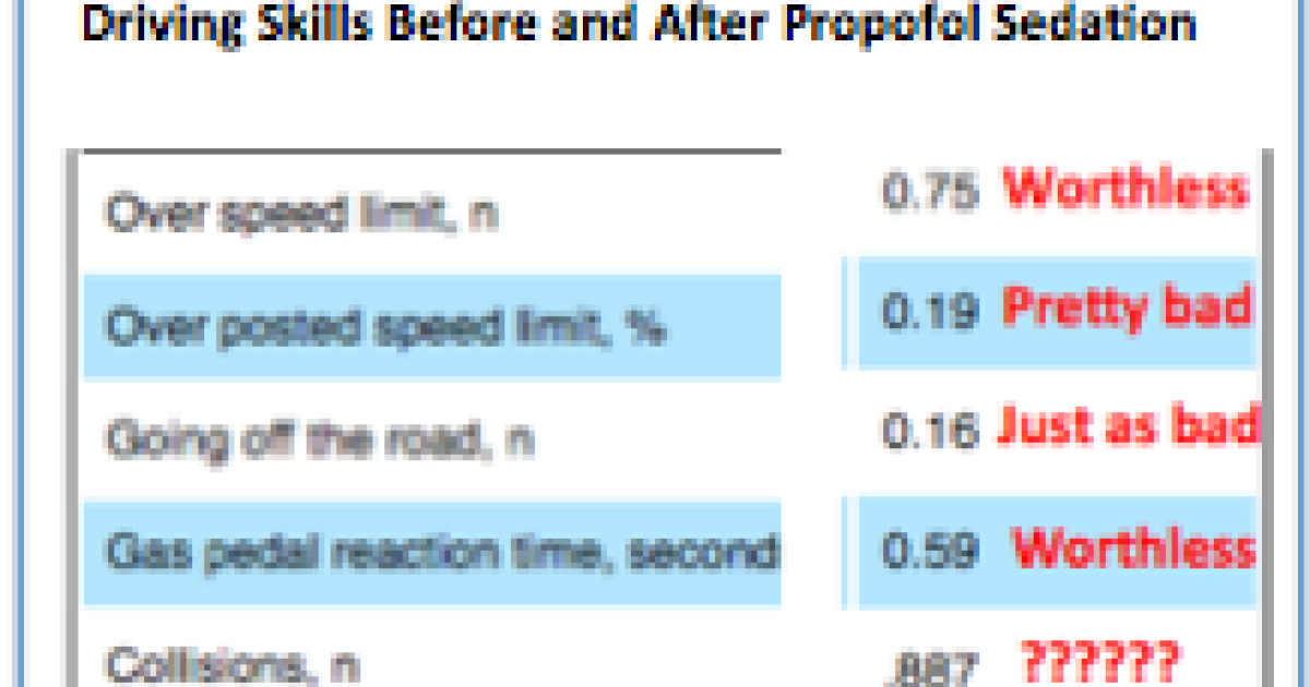What a mess. The authors cite five parameters related to driving following propofol administration, but none of which comes even close to the minimum value (P = 0.05), which is defined as the "gold standard" for attaining statistical significance. Any number higher than that increases the odds the differences in measurements occur solely doe to chance. You will note that none of the five parameters that were evaluated come even close to even the most liberal p-value.