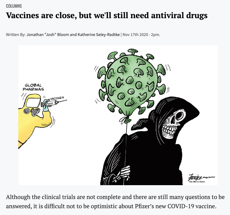 Vaccines Are Close, But We'll Still Need Antiviral Drugs –– Dr. Josh Bloom, ACSH's Director of Chemical and Pharmaceutical Science, along with recurring co-author Dr. Katherine Seley-Radtke, wrote this Op-Ed that appeared in the Duluth (Minn) News Tribune on Nov. 17. It's just the latest opinion piece for this sought-after writing duo.