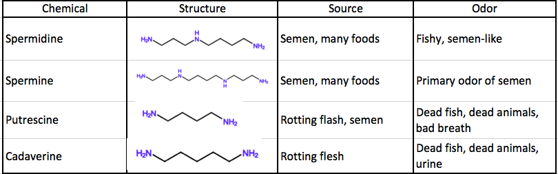 Spermidine's "chemical cousins" are a bunch of doozies. You have smelled at least some of them. And as their names suggest, their odors are not exactly reminiscent of a bouquet of lilies. Here are four low molecular weight polyamines for you to sniff on (2). Just not at the dinner table.