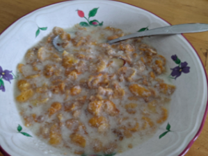 Left: Honey Bunches of Oats bathed in spit-up milk. Center: Close up. The red circles indicate areas of excessive spit-up-age. Right: Spit-up milk poured into the sink in case the other subtle images don't fully capture the magnitude of the event.