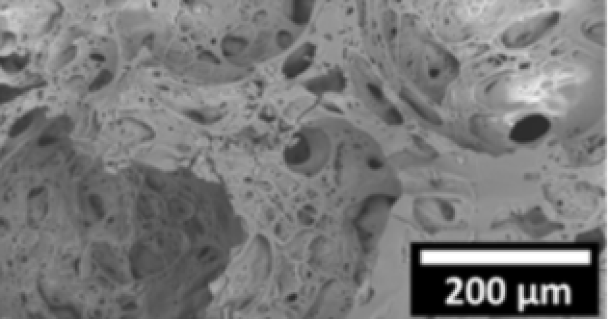 Scanning electron micrograph image of the mineral foam. 200 µM is 0.007 inches. Credit: Cosima Stubenrauch/Universität Stuttgart