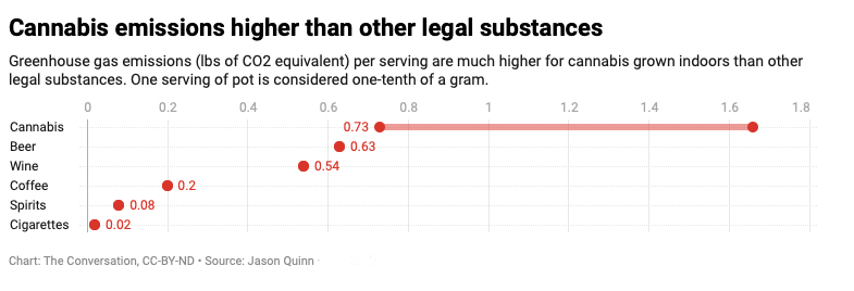 Growing pot indoors requires significant electrical energy to power the lights and air conditioning. It is more often grown indoors for legal sales because it improves the product's quality and consistency and is genuinely a cash crop susceptible to theft. When you factor energy costs in, here is how cannabis measures up with some of our other legal offerings.