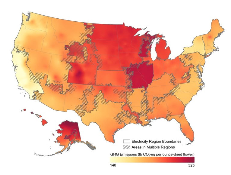 And interestingly enough, Hawaii, a paradise for a growing plant, uses the greatest amount of energy, “324 pounds of carbon dioxide equivalent per ounce. That’s roughly equivalent to burning 16 gallons of gasoline.” Alaska, an area in Colorado and the Midwest, round out the top four carbon footprints.