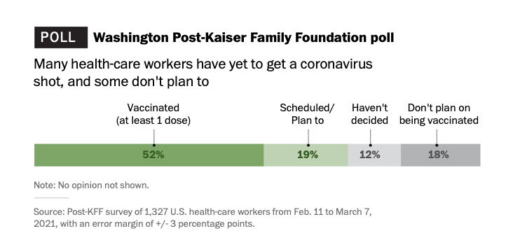 Primarily a fear of the unknown leading to a wait and see approach. Those initial individuals willing to be vaccinated may have been “fibbing” to the survey or themselves, as a more recent poll, done in late February through March, by the Kaiser Family Foundation and Washington Post show. First of all, only 52% of healthcare workers have had at least one vaccine shot – and they have been eligible for vaccination since day 1, a long time to procrastinate and far closer to the original finding in the JAMA study. The reasons to hesitate have not changed.