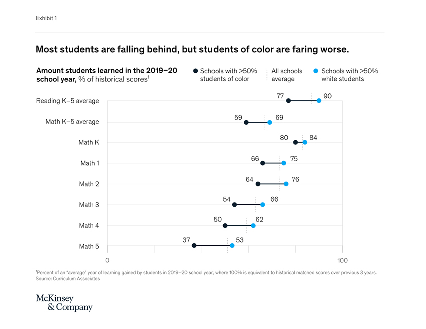 “…students in their sample learned only 67 percent of the math and 87 percent of the reading that grade-level peers would typically have learned by the fall.2 On average, that means students lost the equivalent of three months of learning in mathematics and one-and-a-half months of learning in reading. The learning loss was especially acute in schools that predominantly serve students of color, where scores were 59 percent of the historical average in math and 77 percent in reading.”