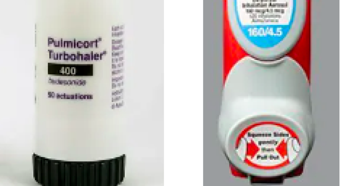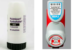 (L) Two (of many) budesonide containing inhalers. (R) The chemical structure of budesonide