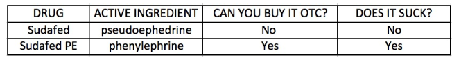 This is nothing compared to what McNeil Consumer Healthcare (part of Johnson & Johnson) has pulled off with Sudafed. Of the 6 brand-name Sudafed products I could find, only one contained pseudoephedrine – the drug that makes the stuff work at all (1). Here is a brief summary of the differences between pseudoephedrine (old Sudafed) and phenylephrine ("new" Sudafed)