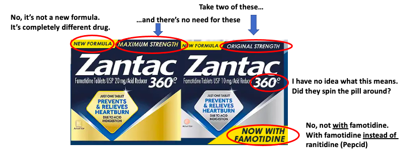 Finally, we have "Now With Famotidine," as if some special new ingredient has been added to the original Zantac to make it even better! Nah, Sanofi just changed the name and did so in an intentionally confusing manner. Maybe they should have just gone with this...