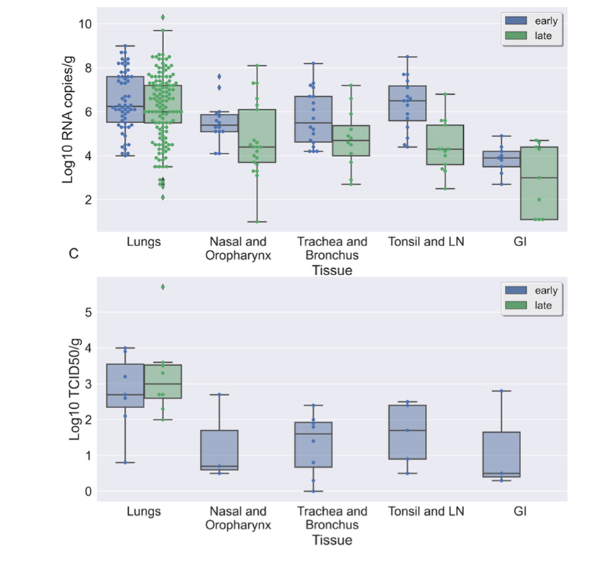 This second graph shows the number of RNA copies from PCR testing or infectious units from those TCID50 counts in the organs of the rhesus monkeys. Using the weight of the lungs, we can extrapolate to the number of virions in a human. There are 109 to 1011 RNA copies, but 4 fold fewer infectious ones. Thus, the number of virions is between 100,000 and 10,000,000. To simply extrapolate to women and children, based on size, would be inaccurate as both groups have different responses to COVID-19 than men. Some studies suggest that the viral load would be further reduced by another order of magnitude for children, but who really knows?